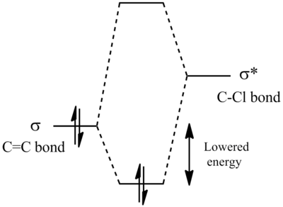 When you desaturate the bond anti to the C-Cl bond, you would then expect there to be no pie cloud, so no electron density and so a stronger C-Cl bond. Looking at the molecular orbitals, there is no similar pie cloud in any of the occupied orbitals that could donate electron density. The LUMO is an anti-bonding orbital which could accept electron density, but there is no electron cloud to donate into this.