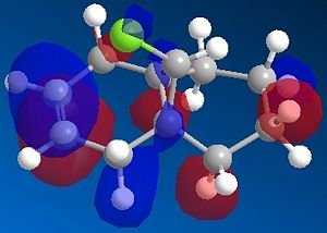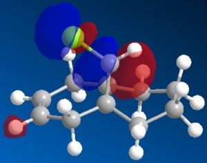 If a nucleophile was to come into the molecule to attack, it would most likely attack the LUMO+1 weakened C-Cl bond from behind in an SN2 fashion. It is the bonds weakness and the large empty (LUMO+1) orbital that leads the attack to happen here.