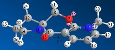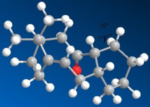 Having looked at different conformations of molecule 5, the one depicted below is the lowest in energy (43.167kcal/mol). Other conformations tried were with the carbons labelled 12 and 8 pointing down instead of up. This gave a -9 angle° and an energy at above 50kcal/mol. Different conformations gave much higher energies and had the oxygen pointing the wrong side to give the required selectivity.