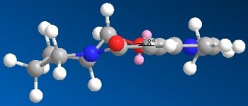Other molecules exhibit different bond angles and lengths, so by putting in different atoms, you could effectively design your molecule. In the third photo below, two of the carbons in molecule 3 have been replaced by sulphurs, therefore lowering the bond angle from 118° to 111°. The energy of the molecule has also been lowered from 35.691kcal/mol down to 31.850kcal/mol. This is due to a longer bond length, giving the whole molecule more room to move and minimise its energy. The bend value has actually gone up to 29.461kcal/mol, but the big energy difference is the torsion, lowering by around 12kcal/mol to -2kcal/mol and therefore actually stabalising the molecule!