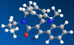 In this project I hope to compare the 13C NMR data for the E- and Z- isomers of Minfiensine. The molecule is taken from an article [2] successfully synthesising the natural product Minfiensine(+). Unfortunatey, there is only 13C NMR data for the E- isomer and so therefore I can only do a direct comparison with this. Due to the structural integrity of the complex ring systems though, the whole molecule should hardly change between the E- and Z- isomer. Hopefully the predicted NMR should correlate to both the E- and Z- isomers, but more to the E- than the Z-. I also hope to look at the predicted optical rotation against given data and compare this to natural minfiensine data.
