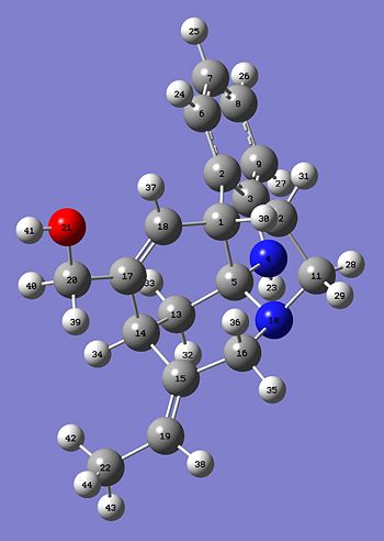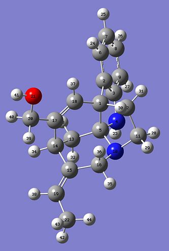 In this project I hope to compare the 13C NMR data for the E- and Z- isomers of Minfiensine. The molecule is taken from an article [1] successfully synthesising the natural product Minfiensine(+). Unfortunatey, there is only 13C NMR data for the E- isomer and so therefore I can only do a direct comparison with this. Due to the structural integrity of the complex ring systems though, the whole molecule should hardly change between the E- and Z- isomer. Hopefully the predicted NMR should correlate to both the E- and Z- isomers, but more to the E- than the Z-. I also hope to look at the predicted optical rotation against given data and compare this to natural minfiensine data.