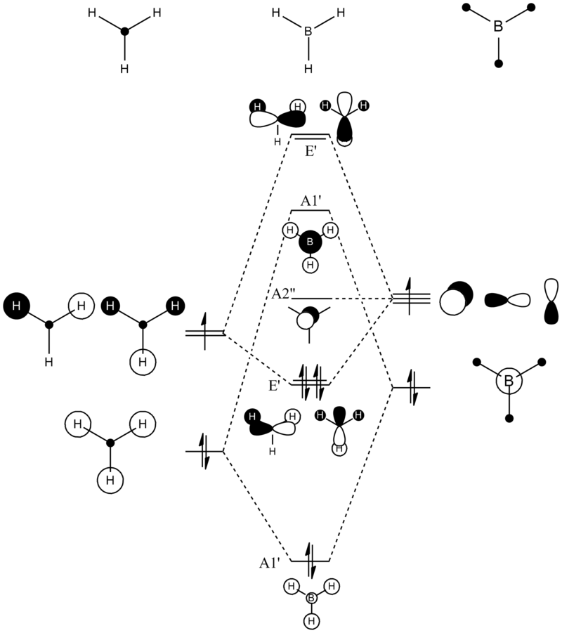 The first time this file was opened, not all of the hydrogen values were symmetric. This was suspicious. When then looking at the orbital contributions, this was also un-even and incorrect. Checking my molecule, I saw one of the H-B-H angles was 119° and another 121°. This meant that the optimization must have gone wrong somehow. BH3 was then re-drawn in a new window and the optimization and MO calculations were done a second time. This time the angles were all 120° and the results above were obtained (all equal).