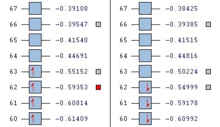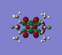 The large table of molecular orbitals below is comparing the orbitals between the normal vandium complex and V2+ complex which has simply had two electrons stripped away from it. The area to look at is orbitals 62-65 as these range from both fully occupied orbitals and fully unoccupied orbitals, as in the images below: