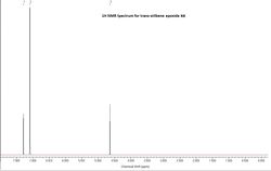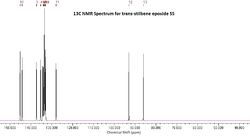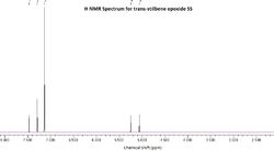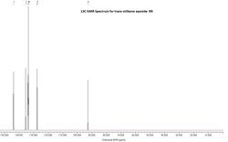 From the 1H NMR for trans-stilbene there is a close agreement between the computed and literature values for the aromatic hydrogen's, as they are all in the chemical shift range of 7.00 - 7.40 which is what is expected of aromatic hydrogen's. However again there is a difference in the chemical shift values between the literature and the computed hydrogen's which are connected to the carbons of the epoxide motif (21 and 22). This could again be due to the lowest energy form of trans-stilbene not being used for the calculation.