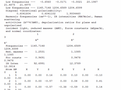 This image from the output file shows the low frequency in the vibrational analysis. If the low frequencies are an order of magnitude lower than the real frequencies then the calculations are of a good calibre, this is the case for my calculations. Furthermore all the vibrations showing a positive value indicates that the calculation has converged at the lowest minima.