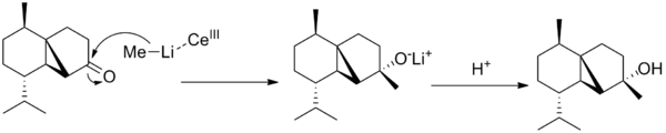 The final synthesis step in the total synthesis of (-)-cubebol is the alkylation of norcubebanone carbonyl with the organolithium MeLi and CeCl3 (figure 26). The CeCl3 prevents the enolate ion from forming and makes sure the alkylation proceeds smoothly.