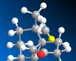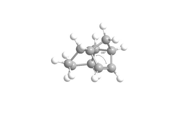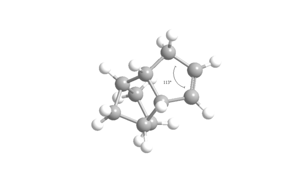 This gives a negative OS energy of -8.8744 kcalmol-1 (41.3808 - 50.2552) meaning the hyperstable bridge-head olefin is lower in energy and more stable than the parent hydrocarbon. The MMFF94 energy for the olefin is 84.1 % that of the parent hydrocarbon. This compares well relatively to the MM2 value of 82.3%. The hyperstable bridge-head olefin is more stable mainly due to having lower bending, torsion and 1,4 Van der Waals energies. In the unsaturated intermediate 10 -chair isomer, the carbons either side of the carbon-carbon double bond are sp2 hybridized so would ideally prefer a bond angle of 120o to the adjacent sp3 hybridized carbon. Conversely, in the saturated parent hydrocarbon isomer, the ideal bond angle is now 109.5o as the hybridization of that same carbon is now sp2. These two bond angles were calculated with the results shown below in figures 10 and 11: