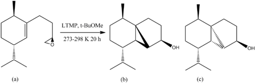 Earlier on in the synthesis, there is another issue of diastereoselectivity (shown below in figure 29) when Lithium 2,2,6,6-tetramethylpiperidide (LTMP) induces an intramolecular cyclopropanation of epoxide (a) in t-BuOMe to give isomer (b) but isomer (c) could also be formed.