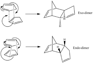 Theoretically, cyclopentadiene could dimerise to form one of two diesteroisomers, either the exo- or the endo-dimer via a Diels-alder π4s + π2s cycloaddition (figure 1). However, experimentally, the dimerisation procedes with specific formation of the endo- dimer rather than the exo-.