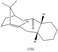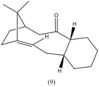 In 1924, Bredt noted that double bonds tended to avoid bridge heads in macrocylic molecules (ring junctions) due to steric ring strain.[7] Despite this, several of these compounds were prepared but the carbon-carbon double bond was found to be highly reactive.[8] These molecules had a positive "olefin strain" (OS) energy which is defined as the strain energy of the most stable parent hydrocarbon subtracted from the strain energy of the olefin.[7] However, O.S Maier et al. discovered a new class of bridge-head compounds with a negative OS energy.[9]These compounds were named hyperstable olefins whereby the olefin is more stable than the parent hydrocarbon. Intermediates 9 and 10 are examples of these hyperstable olefins with high heats of hydrogenation favouring the olefin over the parent hydrocarbon. The geometry of the most stable isomer (intermediate 10 - chair) was again optimised using MM2 along with the resulting parent hydrocarbon. As intermediate 10 - chair and its parent hydrocarbon are not isomeric the hydrogenation equation needs to be balanced by adding a dihydrogen to the unsaturated side. However, when the geometry of H2 was optimised using MM2 it was found to have zero total energy. So in this case, balancing the equation has no effect on the comparison of energies but in other cases of more complex molecules it is important to include all energies. The results are shown below in table 5: