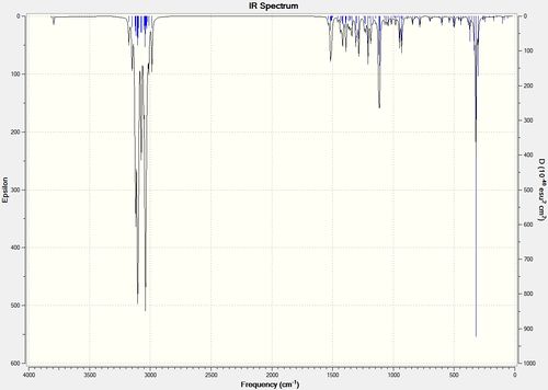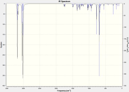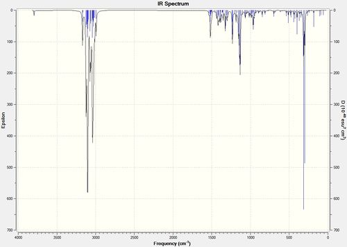 After geometry optimisation using MM2 (on ChemBio3D) an input file was created on the gaussian interface with method DFT=b3lyp and basis set 6-31G(d,p). The file was edited on wordpad so the top line read # b3lyp/6-31g (d,p) opt freq and submitted to SCAN. The vibrational spectra are shown below in figure 25: