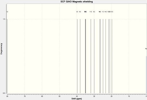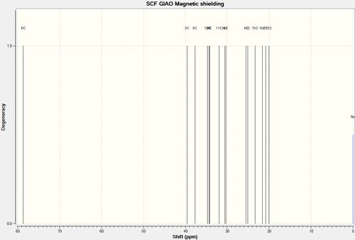 There are no heavy atoms in the molecule like halogens so no spin orbit coupling error needed to be taken into account. The average deviation from the literature was calculated to be 1.38 and 1.43 ppm for (-)-cubebol (1) and its isomer (2) respectively. This shows accurate modelling as the deviation is small but does little to help distinguish between the two isomers prompting further spectroscopic analysis.