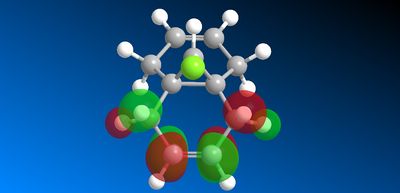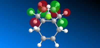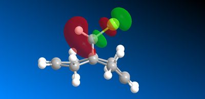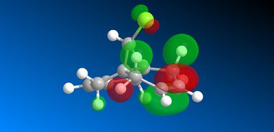 The geometry of the structure was first optimised using MM2 before applying an electronic method. The structure was then run on the MOPAC interface (on ChemBio3D) with method = PM6. The molecular surfaces property was chosen and the HOMO, presumed to be the most reactive towards electrophilic attack, as well as several other valence-electron molecular wavefunction were initially approximated. However, the first molecular wavefunction modelled (MOPAC/PM6 HOMO) did not reflect the molecular symmetry. This HOMO wavefunction shown below in figure 15 is clearly assymetric lacking the plane of symmetry cutting through the chlorine atom and both carbon-carbon double bonds of the molecule.