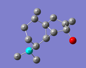 The absolute difference in energy between 9 and 10 is an observable quantity directly related to the equilibrium constant between the two intermediates. The MM2 and MMFF94 methods agree with each other as for both methods, intermediate 9-twist boat(MM2 - 53.0100 kcalmol-1 and MMF94 78.0026 kcalmol-1) and intermediate 9- chair (MM2 - 49.5289 kcalmol-1 and MMF94 73.8573 kcalmol-1) are higher in total energy than intermediate 10-twist boat(MM2 - 46.4336 kcalmol-1 and MMF94 66.335 kcalmol-1) and intermediate 10- chair (MM2 - 41.3808 kcalmol-1 and MMF94 61.2032 kcalmol-1) respectively. Furthermore, the results show that for both intermediate 9 and 10, the isomer with the cyclohexyl chair is lower in energy as expected than the isomer with the the energetically expensive cyclohexyl twist-boat. This difference in energy is primarily due to bend energy as there is more angular strain in the twist-boat form. The cyclohexyl chair conformation is free of angular strain as all of the bond angles are the ideal 109.5o needed for an sp3 hybridised carbon. The 1,4 Van der Waals energies are also higher in the twist boat conformers relative to the corresponding chair conformers. Therefore, only isomers containing the chair conformation will be analysed. According to MM2, intermediate 9 (chair) has a higher total energy of 49.5289 kcalmol-1 than the 41.3808 kcalmol-1 of intermediate 10 (chair) (also confirmed with MMFF94). This confirms that intermediate 10 (chair) is the thermodynamic product as it more stable energy wise. Intermediate 9 (chair) initially forms as it is the kinetic product so must have a lower energy transition state but this cannot be modelled using MM2 as frontier molecular orbitals need to be calculated and are behind the limtits of MM". The MMFF94 results, compared relatively, show good agreement with MM2. The total energy of intermediate 10 (chair) is 82.9 % that of intermediate 9 (chair) according to MMFF94 which is similar to the 83.5 % using MM2. The main reason for this total energy difference is the bend energy which differs by 5.467 kcalmol-1. This shows that there is more ring strain in the in the intermediate when the carbonyl is pointing up compared to when it is pointing down.