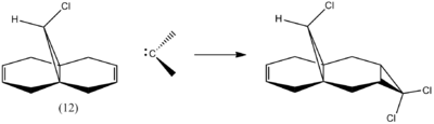 Upon addition of dichlorocarbene to 9-chloromethanonaphthalene (compound 12), π-selectivity dominates as the syn trichloride product (below in figure 14) is the only monoadduct isolated (72 % yield). The pentachloride diadduct is the other product isolated with a lower yield of 23 %.[10]