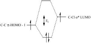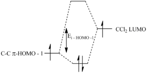 It can be seen that the HOMO -1 orbital has a large build up of electron density on the π-face syn to the chlorine so this face could act as a nucleophile and attack the dichlorocarbene. However, according to the Klopman Salem equation [12], stabilisation energy (Estab is directly proportional to the square of the overlap integral divided by the interaction energy (Ei). This interaction energy is is the difference in energy between overlapping orbitals and the smaller the value, the larger the stabilisation energy.