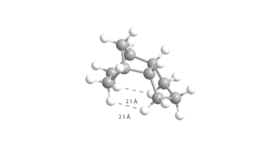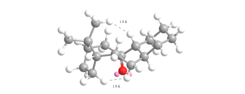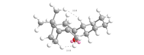 The angle measured for the unsaturated intermediate 10- chair is 123o which is only 3o away from the ideal 120o. However, the angle measured for the saturated intermediate 10-chair is 120o which is 10.5 o larger than the ideal 109.5o. Therefore, there is less angular ring strain and torsion in the unsaturated compared to the saturated intermediate leading to its hyperstability. The other reason for the hyperstability is the Van der Waals energies which are higher in the saturated than the unsaturated intermediate (15.7104 to 12.9205 kcalmol-1). If hydrogen atoms interact at distances ≤2.1Å then they are repulsive but if >2.1Å then they are attractive. Two of the interactions were measured for each intermediate and shown in figures 12 and 13: