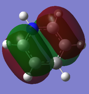 The loss of degeneracy between orbitals 20 and 21 can be more clearly shown in the table below. It shows the pi system orbitals for the aromatic system in the boratabenzene heteroatomic ring and the pyridinium ring Showing LCAO and the computed MOs with relative energies. They are mirror images of each other with degeneracy lost compared to benzene, this is likely due to the charge distribution as shown by the NBO analysis earlier. The Borazine has higher symmetry and maintains degeneracy of the two HOMO orbitals, and hence will have an aromatic pi system more similar to the benzene which was shown previously. It would be interesting to see how the loss of degeneracy affects the stabilization energy that aromatic pi systems usually give, however it seems that it is difficult to quantitavely compared aromaticity due to differences in electronic stuctures of heteroatoms and carbon and incompatibility of different physical and chemical characteristics[4].
