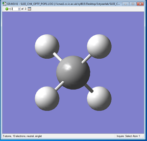 The charge of the Carbon atom found was -0.930, and each Hydrogen atom, +0.233, as calculated by Gaussian. This differed from the expected values of -4 for the Carbon atom and +1 for each Hydrogen atom. A possible reason could be because the expected values are calculated based on the classical model, where charges were assigned to each type of atom. However, the actual values yielded by the Gaussian calculations were performed using quantum mechanical calculations, such that the electron density for each atom was redistributed in order to obtain the most optimized structure of CH4.