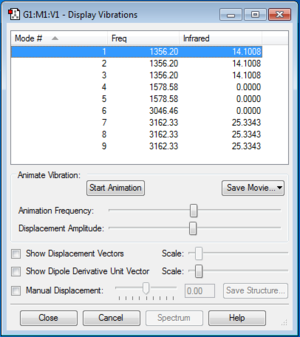 | Which modes are "bending" vibrations and which are "bond stretch" vibrations? | “Bond stretch” vibrations: modes 4, 5 and 6 “Bending” vibrations: modes 1, 2 and 3 |