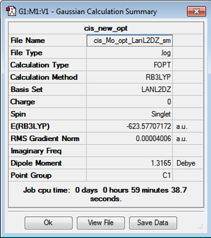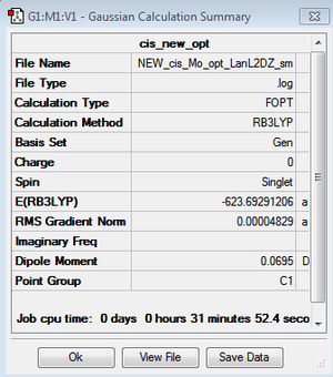 However, the LanL2DZ pseudo potential and basis sets are still inaccurate for the phosphorus as they only take into account a minimal basis ie. s and p valence orbtial functions. Phosphorus has low lying d orbitals which explain its tendency to form hypervalent compounds. Therefore, the optimised structures were again optimised but with the additional dAO functions. The adulterated .gjf input file was submitted to SCAN (cis - (DOI:10042/to-10624 ) & trans - (DOI:10042/to-10625 )) and the .log file analysed on GaussView 5.0. These newly optimised structures taking into account dAO interactions and their results summaries are shown below for the cis- and trans- isomers in figures 26 & 27 and figures 28 & 29 respectively.