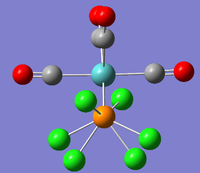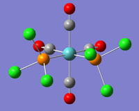 Both isomers were sketched on GaussView 5.0 and .gjf input files created. Firstly they were loosely optimised (job type = OPT), method = B3LYP with basis set LANL2MB and additonal keyword opt=loose. The cis and trans input files were submitted to SCAN (cis (DOI:10042/to-10516 ) & trans (DOI:10042/to-10517 ) and the resulting .log files analysed on GaussView 5.0. This low level optimisation is useful in finding bond lengths and bond angles but falls short for dihedral angles affecting the P-Cl geometry. If these bonds are not in their optimsed geometry then a local minimum may be found instead of the required global minimum. Therefore, the two loosely optimised structures were altered on GaussView 5.0 shown below in figures 20 and 21. For the cis- isomer, on one P atom one Cl is pointing up parallel to the axial bond whereas on the other P atom one Cl is pointing down parallel to the axial bond. This ensures a torsion angle of 180o(figure 20). For the tran- isomer, the two PCl3 groups are eclipsed ensuring that one of the P-Cl bonds aligns with one of the Mo-C bonds (figure 21).
