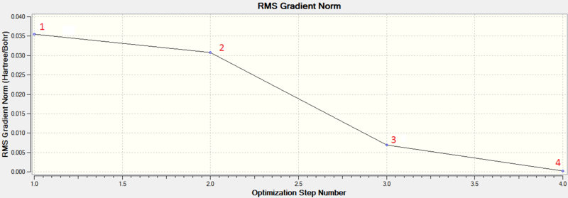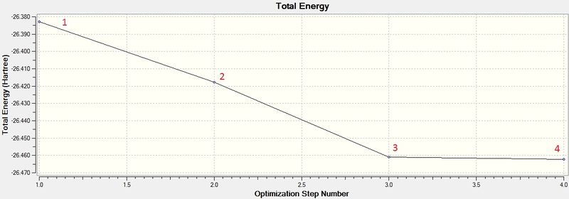 Figure 2 shows that the forces (gradient of energy vs. distance graph) are converged as well as the displacements meaning for a small displacement the energy does not change.The .log file also confirmed the optimised bond lengths and bond angles stated before (figure 3). The optimisation was further analysed by opening the .log file on GaussView 5.0 and viewing the optimisation results. The two graphs in figure 4 and 5 show how the energy and gradient respectively have changed over the optimisation. Table 1 shows the structure of the molecule corresponding to each of the four stages of the optimisation.