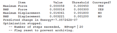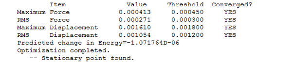 The gradient of 0.00020672 a.u is less than the 0.001 a.u needed to ensure optimisation but ideally the number should be as close to zero as possible. Further analysis of the .log file confirmed that job had really converged (figure 2):