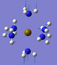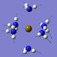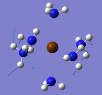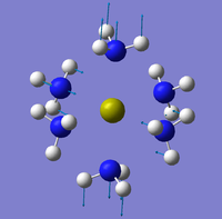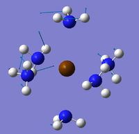 This suggests that the geometries are not fully optimised as there are negative frequencies. However, it can be seen that all of these negative frequencies correspond to various wags of the NH3 groups about the M-N bond. It was seen from the optimisations that the maximum forces had indeed converged just not the maximum distances. This is due to this wobbling of the NH3 groups which are prone to this. The same metal-nitrogen stretch vibrational frequency was found for all 3 compounds shown in table 15 below. Two NH3 groups trans to each other stretch away from the metal centre whilst the rest of the NH3 groups asymmetrically compress towards the metal centre.