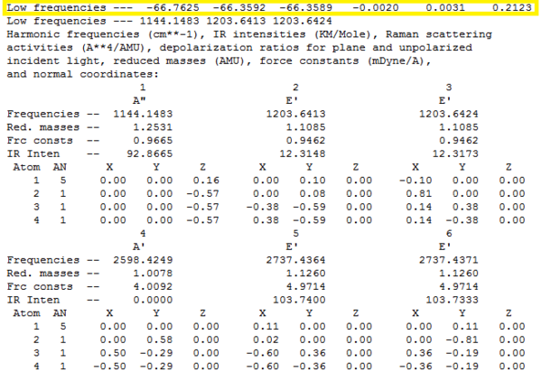 The low frequencies were found from the .log file as for the BH3 molecule shown below in figure 18.