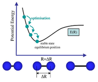 The first two structures are missing bonds due to the distances exceeding some pre-defined value GaussView uses but they are still there. It can be seen that the last structure has the most negative energy and also that the gradient is closest to zero at this minimum energy. This can be rationalised by looking at the dissociation curve of a diatomic representing a potential energy curve. When the distance between the nuclei is small they repel each other (raising the energy) but as this distance is increased a stable state is reached. Further elongation of the bond decreases the nuclear attraction which also increase the energy. The stable point mentioned is the equilibrium between these repelling and attractive forces where there is no net force acting upon the molecule. When optimising a molecule, this stable point is trying to be attained. The schrödinger equation is solved for a particular position of nucleus and electrons to obtain an energy E(R). It is then solved again with a slight change in the position of the nucleus and electrons to find a new energy E(R'). If this energy is lower than E(R), the process is continued until the energy stops decreasing as the stable state has been achieved (figure 6). This can be seen in figure 4 as the Total energy keeps decreasing until it is lowest for structure number 4. At this stable point (figure 6) the curve is neither increasing nor decreasing. This can be seen in figure 5, as the gradient of the last optimisation step is closest to zero.[2]