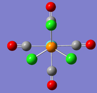 The calculated frequencies in general are not that accurate compared to the literature due to the low accuracy method and the substitution of chlorines for the phenyls. The 4 carbonyl frequencies of the cis isomer are shown as predicted. The trans isomer has higher symmetry than the cis isomer so has more IR inactive vibrational modes resulting in just 1 carbonyl frequency expected. However, the calculated values show two vibrational modes due to the two degenerate frequencies at 1938 and 1939 cm-1. One stretch involves two trans carbonyls stretching symmetrically whilst the other two carbonyls are still. The degenerate frequency is the same but the previously stationary carbonyls are now stretching symmetrically whilst the other 2 are still.