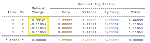 Finally, the "Natural Bond Orbital (Summary)" shows the energy and population or ocupation of the different B-H bonds as well as the B lone pair.