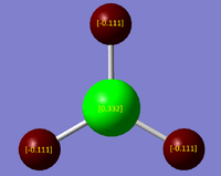 The .log file of the energy calculation used for the MO analysis was opened on GaussView 5.0 and the charge distribution selected from the results tab. The colour atoms by charge option was selected with bright green indicating highly positive charge and bright red indicating highly negative charge. "Show numbers" was also selected to find the NBO charges of the boron and hydrogen atoms. However, there seemed to be a glitch on GaussView 5.0 and the numbers would not all show together. Therefore the molecule was edited on paint to include the numbers shown (figure 9). These NBO charges shown were -0.111 D for the hydrogens and 0.332 D for the boron. However, the charge is only accurate to 0.01 D and so the actual charges are -0.11 D for the 3 hydrogens and 0.33 D for the boron.