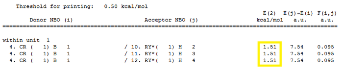 Second Order Perturbation Theory Analysis of Fock Matrix in NBO Basis Figure 12 below shows any mixing between MOs.The main interactions are from bonding NBOs into non-bonding or anti-bonding orbitals. All 3 values in the E(2) column (1.51 kcalmol-1 are less than 20 kcalmol-1 needed to be of interest so there is no useful information for this particular molecule.