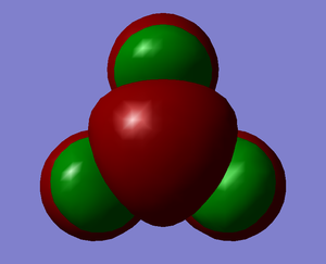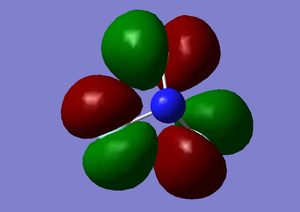 Figure 5: The 2nd least energetic occupied orbital is fully antibonding in character due to repulsion and zero overlap. It is likely to be used in reactions as it is in the outer shell and is low in energy with -0.42224 a.u. It is made up of 3 p orbitals and 1 s orbital.