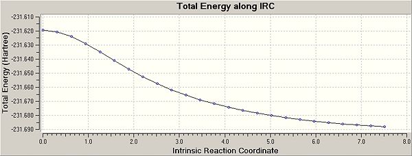 Implementing the first method afforded an energy level of using RHF/3-21G. The second method gave an IRC curve with a well-defined minimum as shown below: