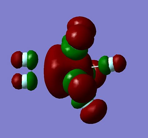 It can be seen from the table above that the Cis complex (-623.693 Hartrees or 1637506 KJ/mol) is slightly higher in energy than the Trans complex (-623.694 Hartrees or 1637509 KJ/mol). The reason for this most likely due to the steric clash between the two PCl3 in the cis complex, although it the energy differece between the two complexes is only 3 KJ/mol. These results here that the Trans complex is energtically more stable than the Cis complex thermodynamically is confirmed experimentally by Darensbourg, who found that under thermodynamic conditions that cis-[Mo(PPh3)2(CO3)] readily isomerises to trans-[Mo(PPh3)2(CO3)] and in the calculations perfored here it is assumed that -Cl groupd are similar to -Ph groups electronically. However, Bennett et al found that cis-[Mo(PPh3)2(CO3)] was more stable electronically in the gas phase and suggested that the reason that the trans-complex may seem more stable is due molecule-molecule interactions and enviromental factors in solids. If it was wanted that the cis-complex of the type [Mo(PR3)2(CO3)] was the more stable and less reactive than the trans complex, then the R group should -OH. An -OH group would allow intra-molecular hydrogen bonding between the -P(OH)3 groups as they are next to each other in a cis-complex, where as intra-molecular H-bonding would not be possible this complex if the -P(OH)3 were trans as they would be too far away. It maybe suggest that H-bonding could be possible to the -CO groups, although distance and orination is most likely still going to be an issue. The H-bonding would lower the energy of the complex, making the cis complex more stable. If it was wanted to make the trans-complex of the type [Mo(PR3)2(CO3)] a lot more stable than the cis complex, then make R a very large alkyl group. This would increase steric clashes between the large next to each other in the Cis complex, increasing it energy, but would make little difference to the trans-complex, as the large -PR3 are on the opposite sites of the molecule.