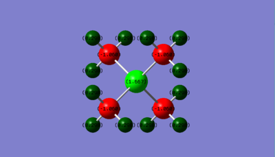 The [P(CH3)4]+ cation has the most positive charge residing on the phosphorus atom (+1.667) this differs from the [N(CH3)4]+ cation where the central Nitrogen atom has a slightly negative charge (-0.295). This suggests that the models used to represent [NR4]+ (R=alkyl) which are often depicted with the positive charge placed on the nitrogen centre are not significantly valid as although the molecule has a formal positive charge due to the nitrogen atom being 1 electron deficient, in reality the distribution of electrons and hence the charge does not reflect this. The charge distribution will be affected by additional intrinsic factors of the atoms such as electronegativity. Nitrogen is more electronegative than phosphorus therefore it is more polarising, this results in the nitrogen ionic complex having an electron-withdrawing effect on its ligands resulting in the most positive charge within the molecule being located on its hydrogen atoms.