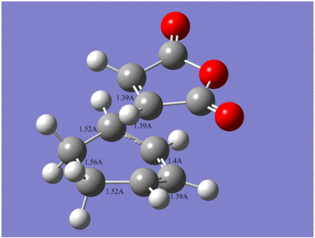 Also it can be suggested that the longer space distance in exo is also due to a sterics clash between the oxygen groups of maleic anhydryte and the CH2-CH2 (compared to CH=CH in endo). The bond lengths within the each molecule are quite similar and are indictaive of the type of bond which is formed in the product. If we refer to the literature C-C bond lengths mentioned above it can be seen that the C=C bonds which are forming(1.39A) isare aproaching 1.34A bond length of a typical C=C. Double bonds which are breaking are slightly longer(1.4 A) , and are still far off from a C-C literature bond length , this can be due to the fact that the two molecule through space distance is still only within van der Waals radii from each other(not within C-C bond distance) and therefore supports an argument of this being an early transition state. The C-C bond which is going to be bridging is slightly longer than a typical C-C bond , this is due to the strain it would experience.