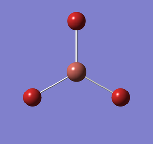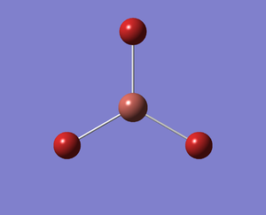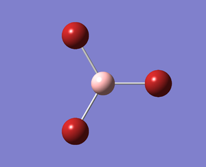 A molecule of BBr3 was created from the fully optimised BH3 (6-31G(d,p)) molecule. It was then optimised, with the calculation being carried out on the HPC using psuedo-potentials. The output log file is linked to here and the link to the D-space file is http://dx.doi.org/10042/23205. A Gaussview image of the optimised molecule is shown in Figure 14.