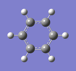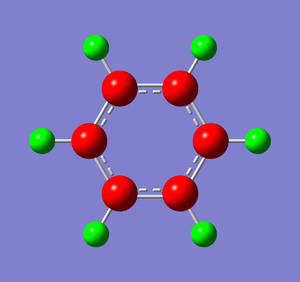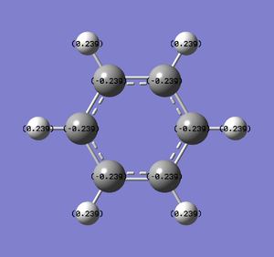 Natural Bond Orbital Analysis was carried out on a molecule of benzene, using the output log from from the population analysis. Figure 33 shows a Gaussview image of the charged molecule. Bright red represents a highly negative charge and bright green indicates a highly positive charge. The charge range for the NBO of benzene is -0.239 to +0.239. As shown in Figure 34, the C atoms have a charge of -0.239 and each H has a charge of +0.239.