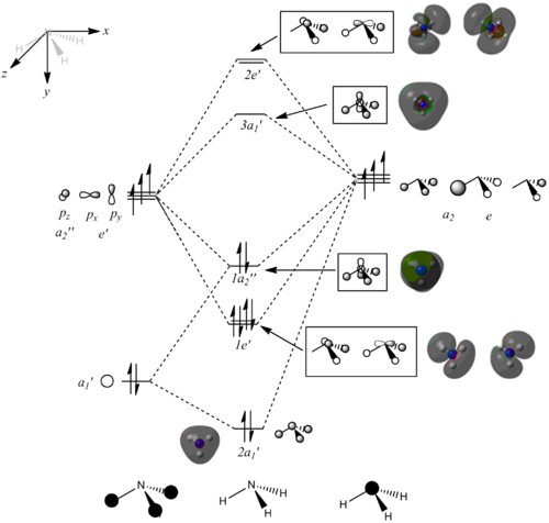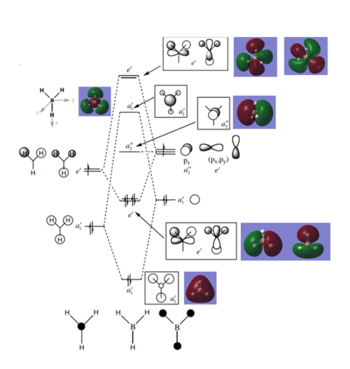 The molecular orbitals of BH3 were obtained using the fully optimised molecule (6-31G). The output log file is linked here and the link to the D-space file is http://dx.doi.org/10042/23263. An MO diagram of the trigonal planar molecule was created in ChemDraw. The LCAOs for each energy level were included, as well as a snap-shot of the "real" MOs obtained in Gaussview. The completed MO diagram is shown below: