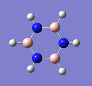 A molecule of borazine was created and optimised in Gaussview. Since it is a fairly large molecule, a low level basis set (3-21G) was initially used to ensure the structure was roughly correct. The output log file of this optimisation is linked to here and the link to the D-space file is http://dx.doi.org/10042/23242. A Gaussview image of the optimised molecule is shown in Figure 53.