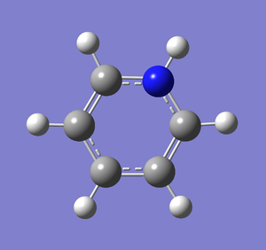 A molecule of pyridinium was created and optimised in Gaussview. Since it is a fairly large molecule, a low level basis set (3-21G) was initially used to ensure the structure was roughly correct. The output log file of this optimisation is linked to here and the link to the D-space file is http://dx.doi.org/10042/23245. A Gaussview image of the optimised molecule is shown in Figure 44.