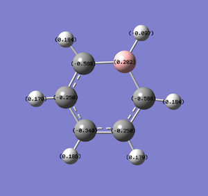 In the boratabenzene molecule, the boron atom is electropositive with a charge of +0.202. In order to counteract this positive charge, the five carbon atoms in the ring all vary in their degree of electronegativity. The two neighbouring carbon atoms have a large negative charge of -0.588 and appear bright red in the Gaussview image, whereas the remaining three carbon atoms are less electronegative. Furthermore, the hydrogen atom bonded to the boron appears to have a very small negative charge, which is influenced by the electropositivity of the boron as well as the -1 charge of the system. The other five hydrogen atoms are all positively charged, with various values depending on the carbon ring to which they are attached.