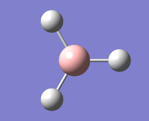 A molecule of BH3 was created and optimised in Gaussview, a program which uses different approximations to solve the Schrodinger equation. A low level basis set (3-21G) was first employed to ensure the structure was roughly correct. The output log file of this optimisation is linked here and a Gaussview image of the optimised molecule is shown in Figure 1.