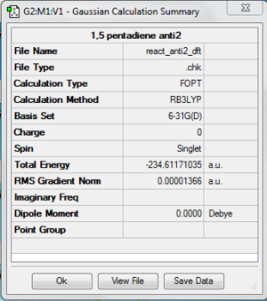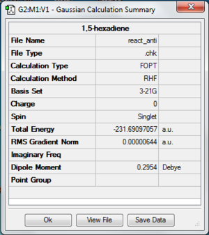 A molecule of 1,5-hexadiene with anti-periplanar conformation is drawn using Gaussview. First, the Job Type has to change to Optimisation. The molecule is calculated using Hartree Fock as a method and 3-21G as a basis set. Under the Link tab, the memory limit has to change to 250 MB and the calculation is submitted. The energy of the molecule for this conformation is -231.69097057 au. The point group is C1 and it has no symmetry. The molecule is exactly the same as Anti 4 in Appendix 1. File:React anti.chk