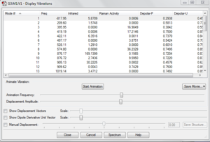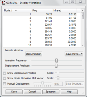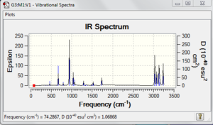 Using the optimized B3LYP/6-31G* structure, frequency analysis is carried out. First, Frequency is selected in the Job Type instead of optimization. Check the method is correctly input and submit the calculation. The frequencies mode and infrared spectrum can be seen by selecting Vibration under the Results tab. The following is the IR spectrum. File:React anti2 freq.chk